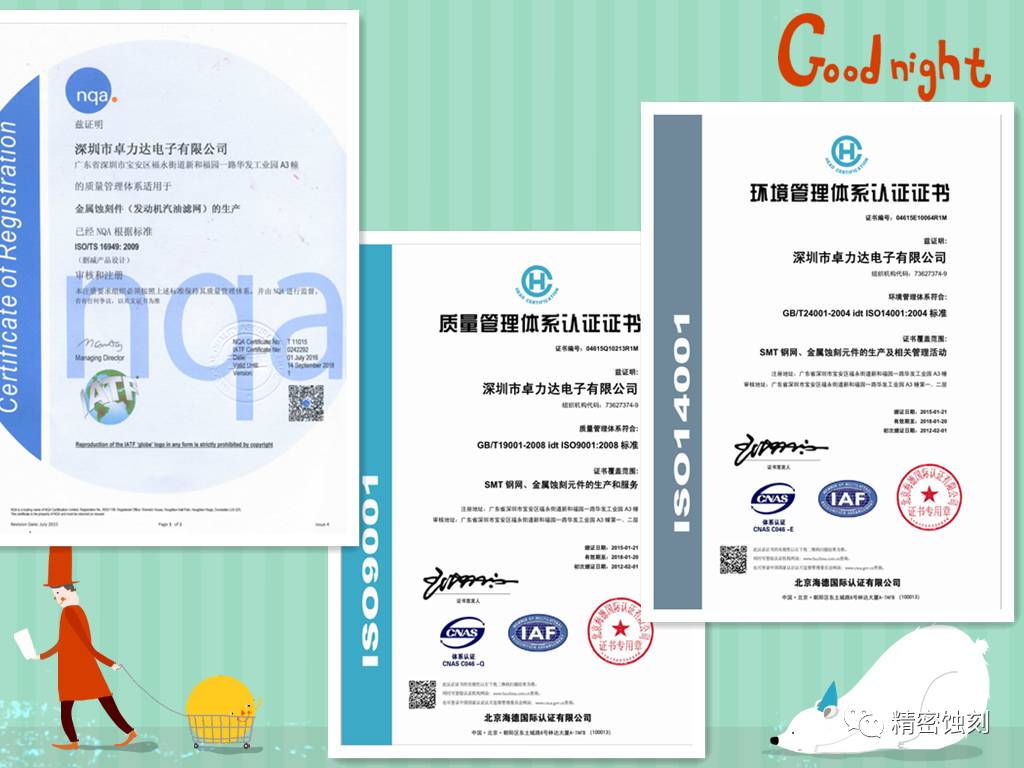 卓力達是一家專業從事精密金屬蝕刻零部件以及精密激光切割的研發和生產型高新技術企業,公司在2004年12月通過ISO9001:2008質量體系認證;在2007年7月通過ISO14001:2004版環境管理體系認證;在2016年7月通過ISO/TS 16949:2009汽車體系認證。
