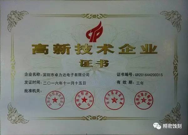 高新技術企業的認定,標志著卓力達在精密蝕刻技術以及產品的開發能力和自主創新、持續創新的能力,能進一步激發企業自主創新的熱情,為卓力達打造國內精密蝕刻行業領頭者提供了強有力的支持!